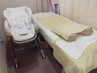 小さなお子様や赤ちゃんをご同伴されても大丈夫です。ベッドの傍や待合室でお待ちいただけます。スウィングのベビーチェアーを用意しております。施術スペースはカーテンと壁で仕切りがありますので安心して治療を受けることが出来ます。