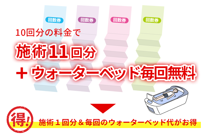 【保険外の施術につき】10回分の料金で「11回分施術 + ウォーターベット毎回無料」になります。(有効期限あり)